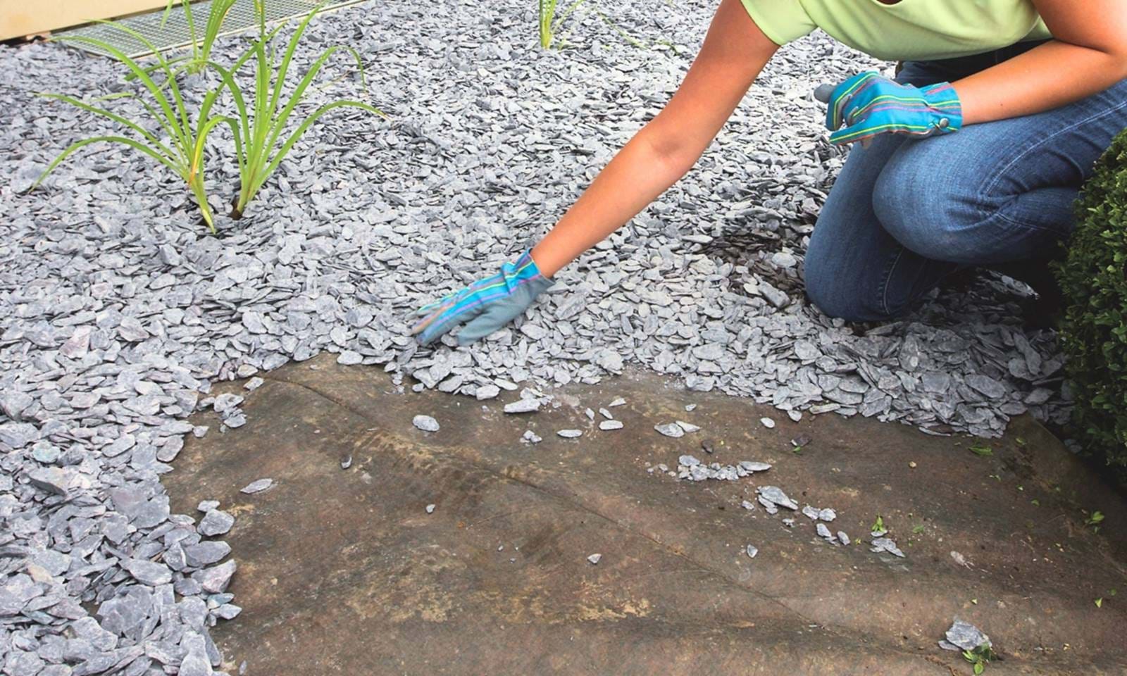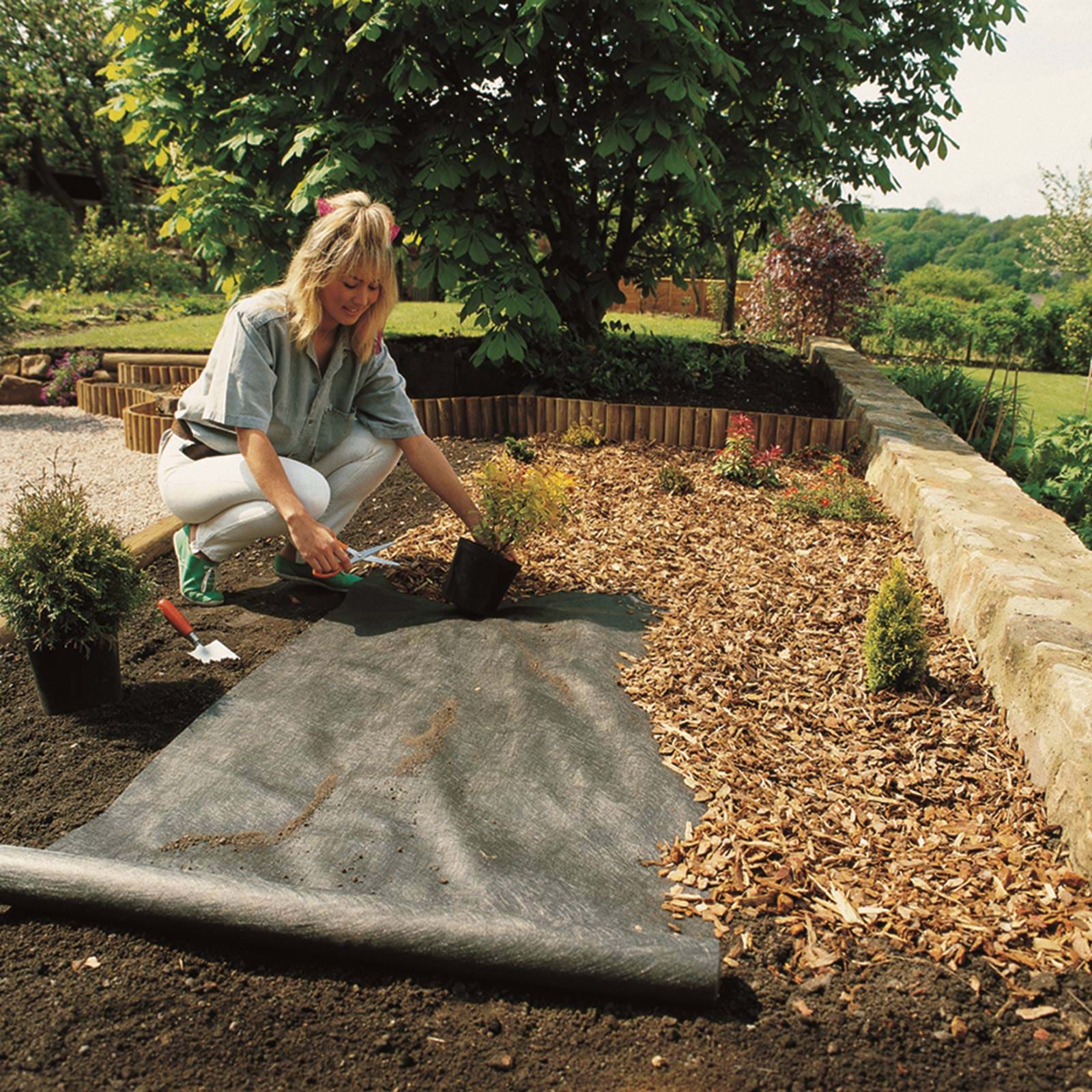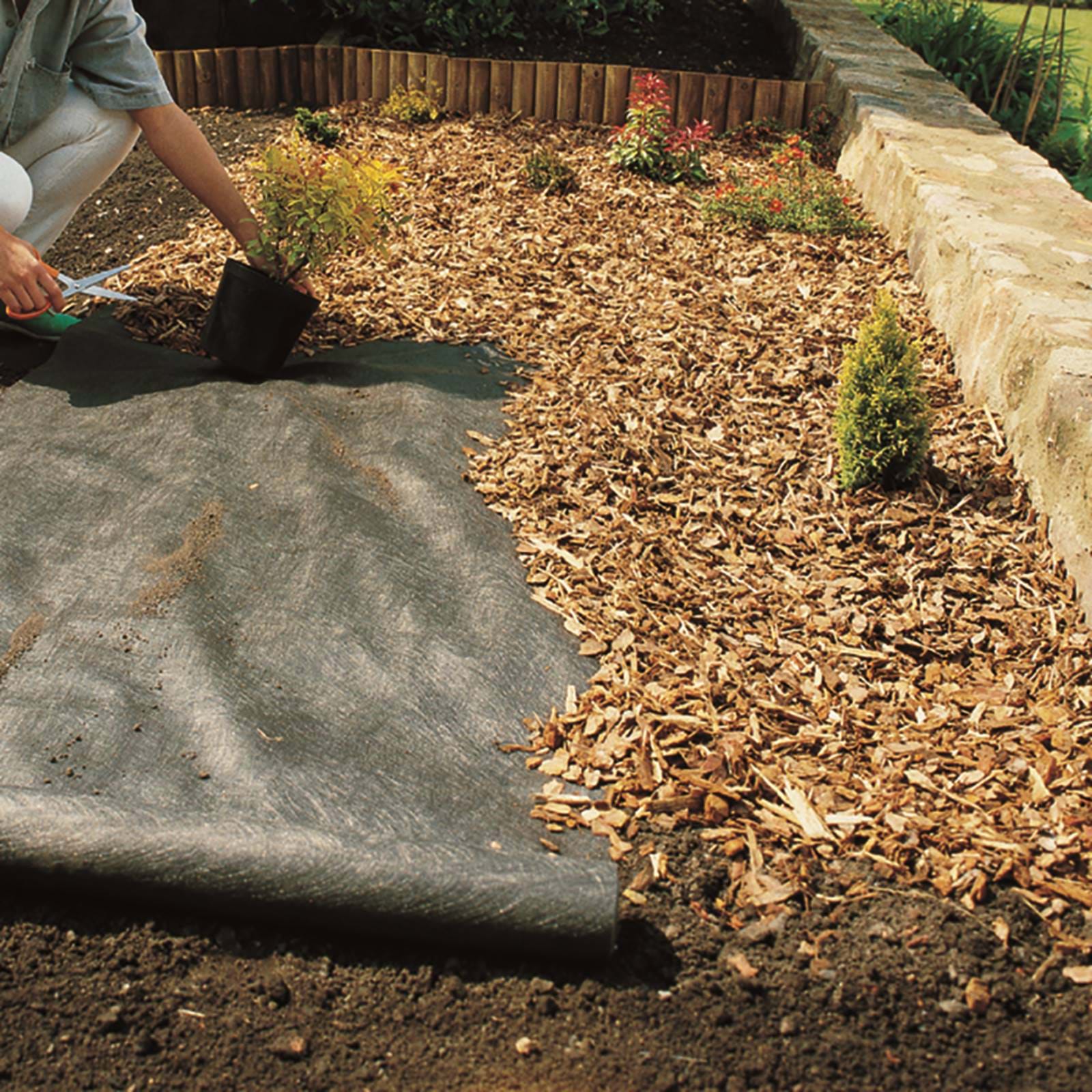 Når du dækker ukrudtsdugen med 5 cm flis, skærver eller andet dækmateriale, kan ukrudtsdugen holde i mere end 20 år.