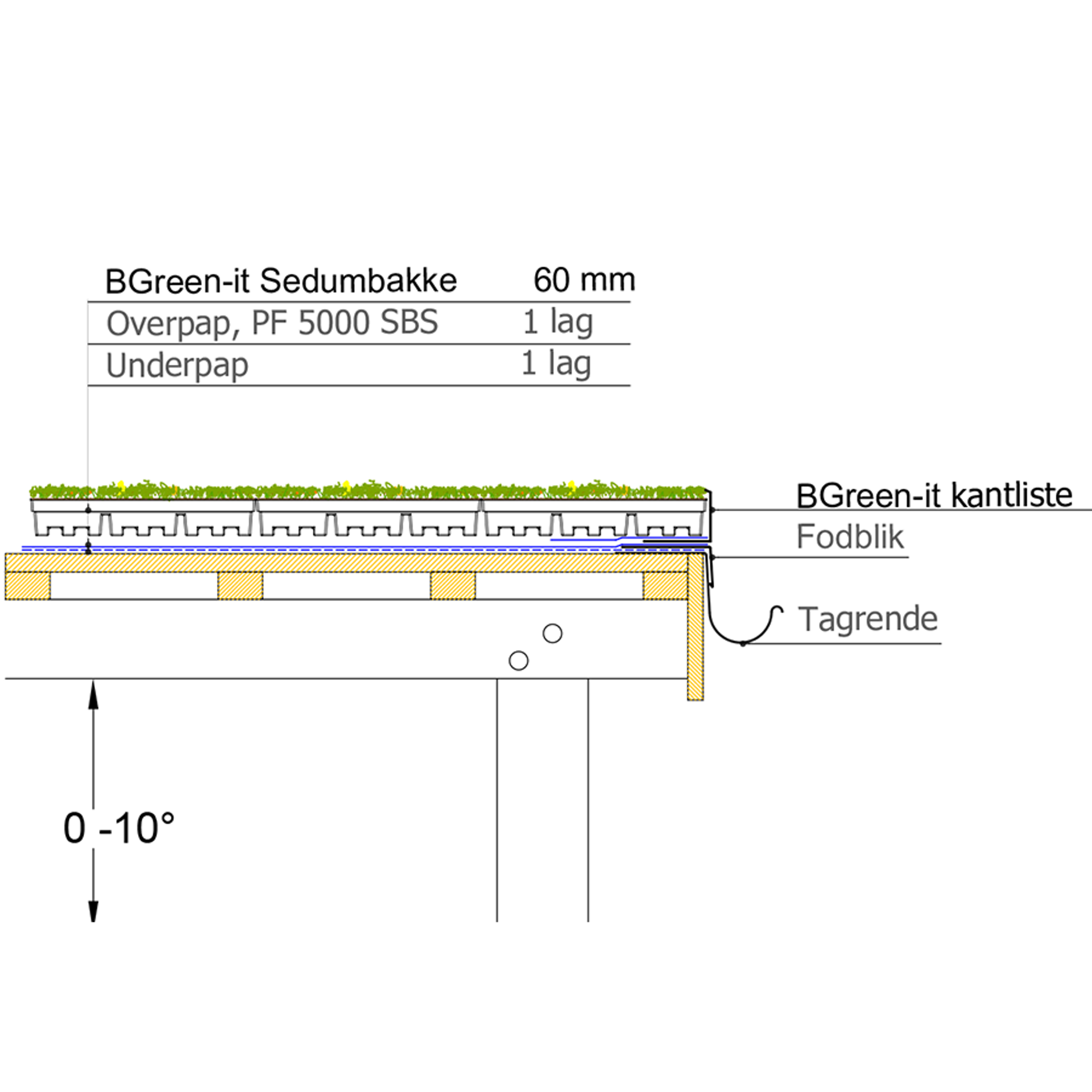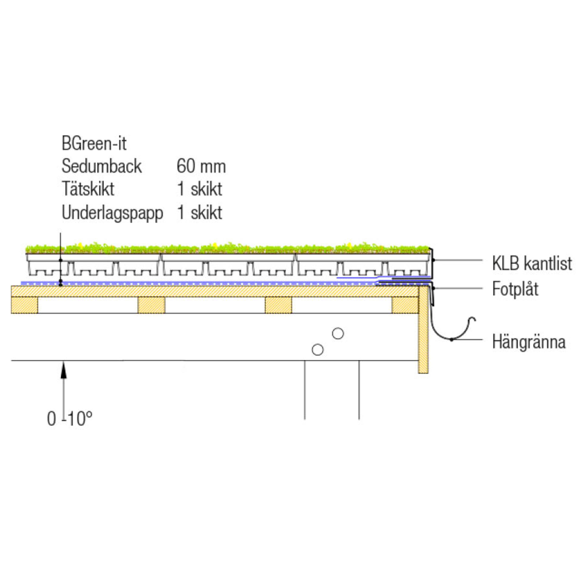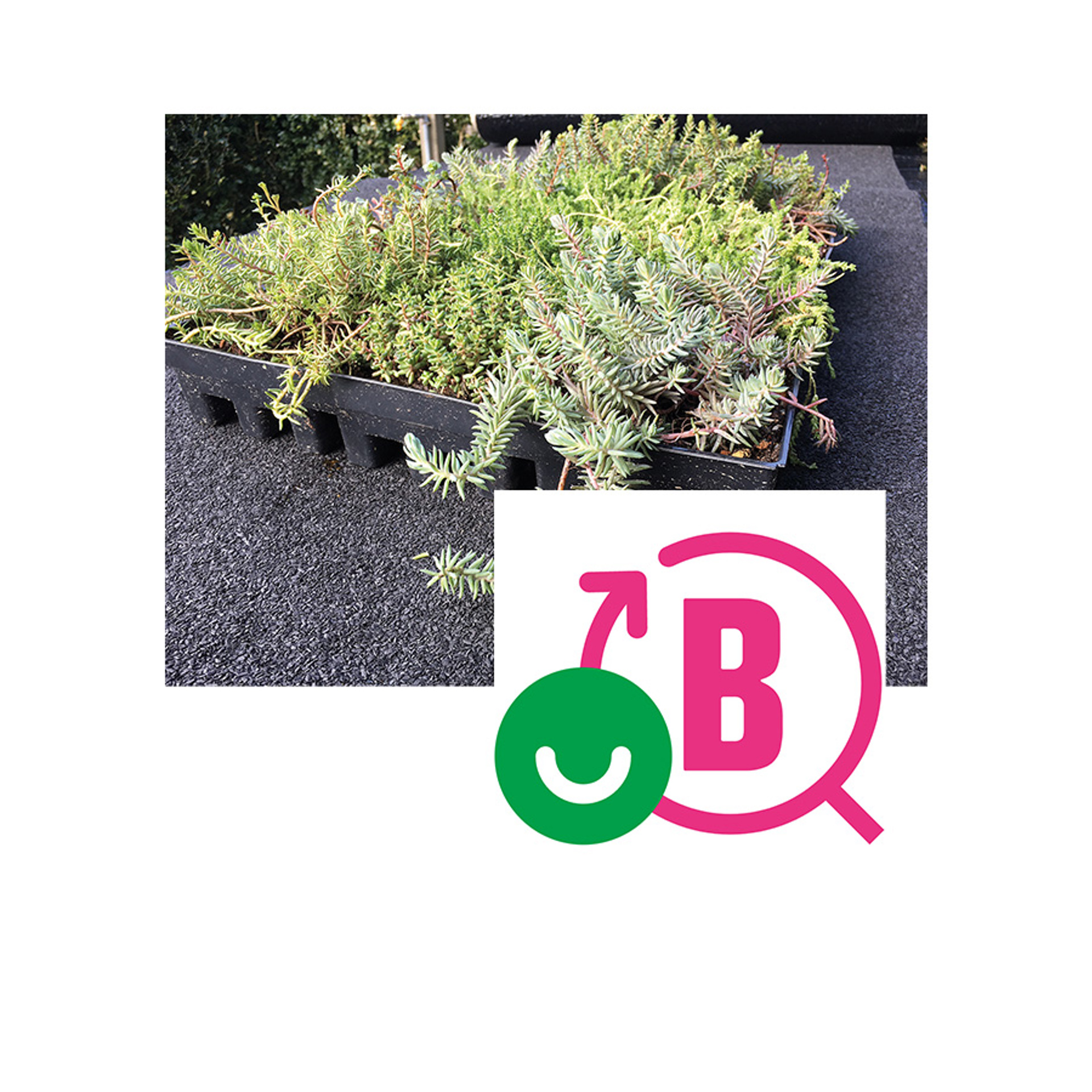 Brettene er produsert av resirkulert PET-plast som er svært motstandsdyktig mot varme- og kuldepåvirkning. Sedumbrettene inneholder alle de komponentene som et omfattende grønt tak behøver - samlet i ett produkt. Drenering og vannreservoar, et spesielt lettvektsjordsubstrat og et ferdig dekke med sedumplanter. Den ekstensive takvegetasjonen er ikke egnet til opphold og aktiv bruk, men sedumplantene tåler ferdsel i forbindelse med vedlikeholdsarbeid. Rotsperrefolie eller rothemmende takpapp kan unnlates under BGreen-it Sedumbakker, hvis det foreligger en vedlikeholdsplan for taket.