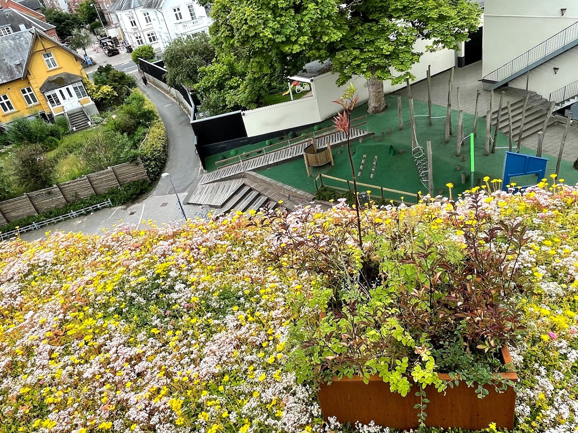 3. Når og i hvilke farger blomstrer plantene på taket?
