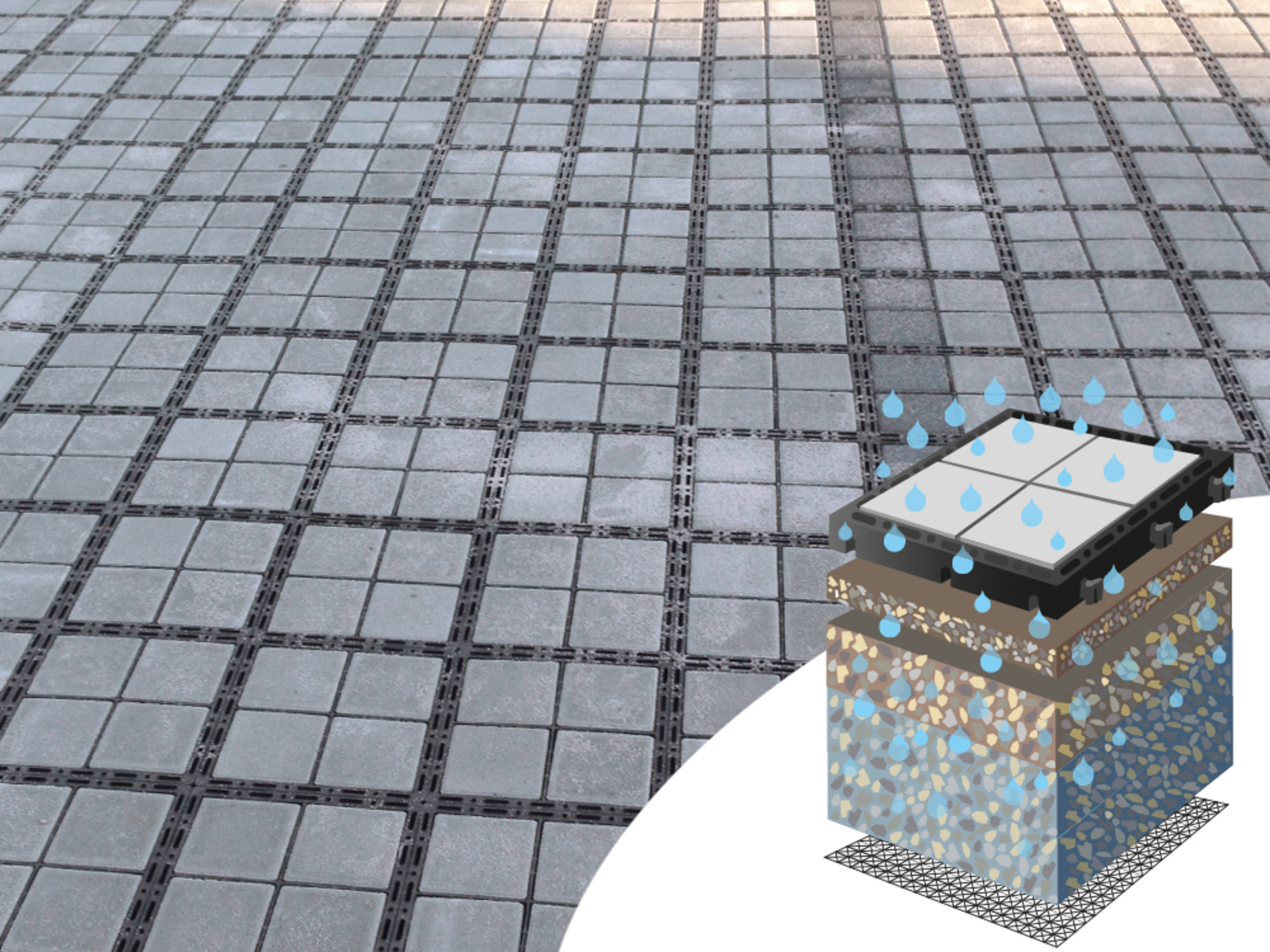 Det unikke ved ECORASTER Bloxx er, at afvanding sker gennem selve rammen, der hverken skal spules, renses eller suges, og IKKE gennem fugegruset mellem fliserne. Mange andre permeable belægninger er baseret på, at fugegruset efter en årrække skal udskiftes, da permeabiliteten efterhånden forringes eller helt forsvinder.