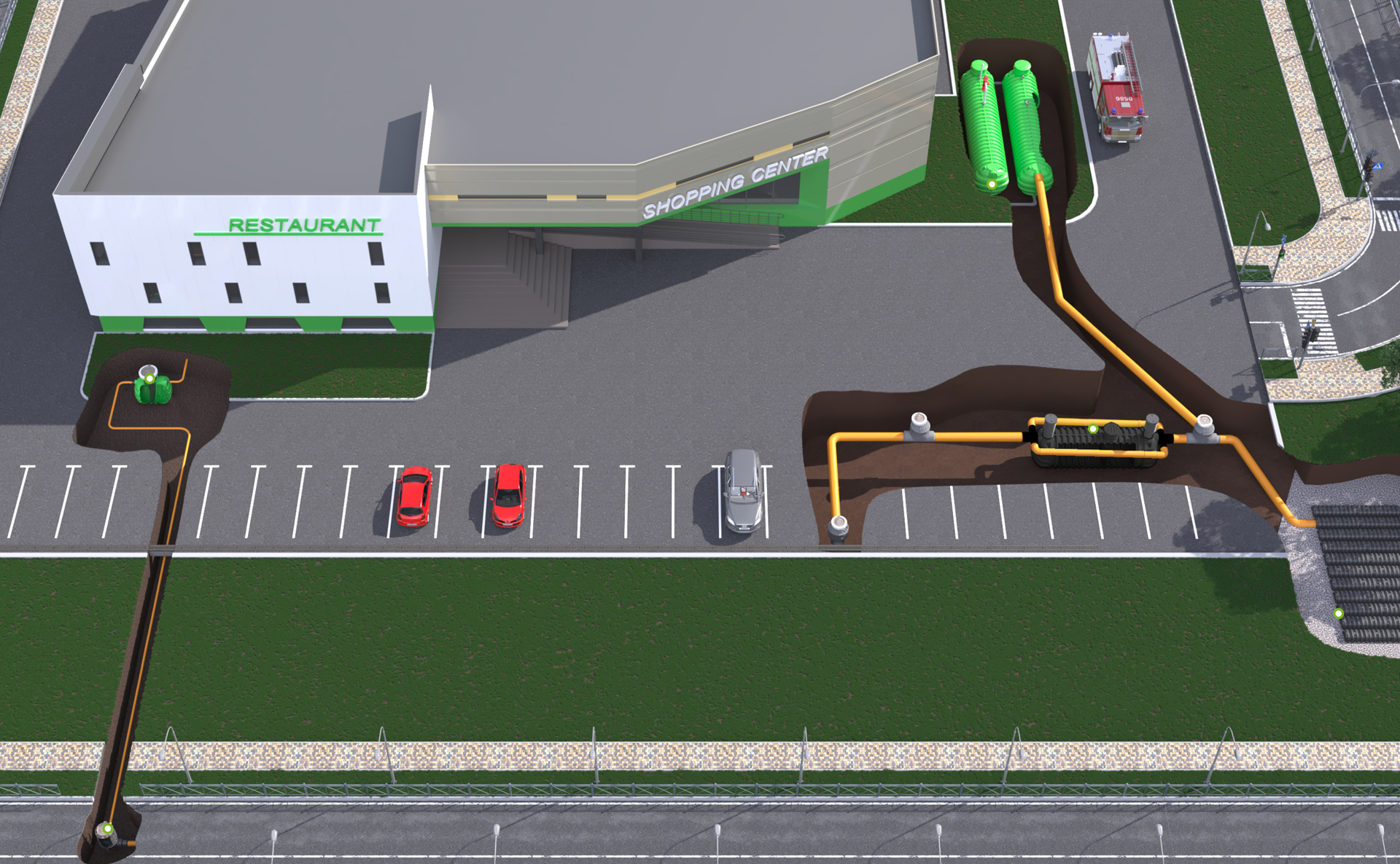 RoDrive er den ideelle løsning til områder med begrænset plads og højt grundvandsniveau. De certificerede RoTerra Drive tanke kan installeres under køreflader og optimerer pladsen til opsamling af regnvand, spildevand eller brandslukningsvand, selv under tung trafik.