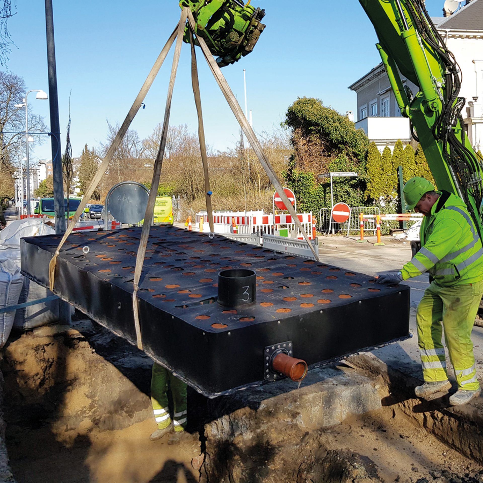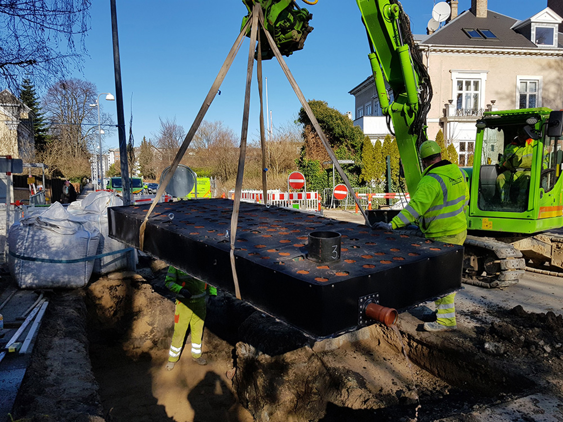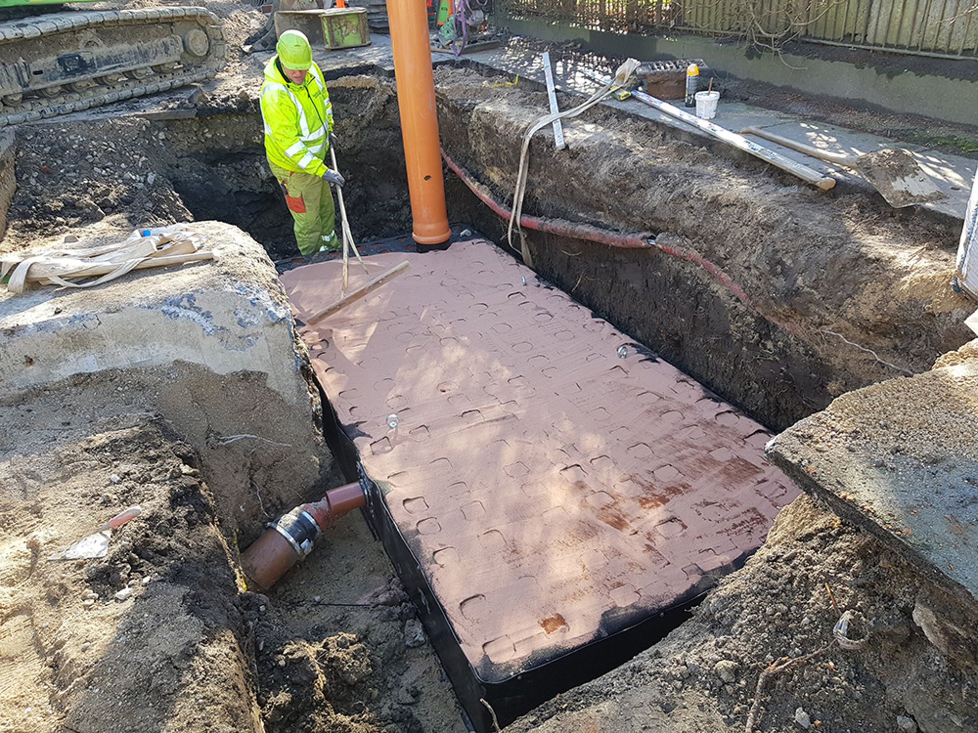 Til sidst monteres integrerede inspektionsskakte og tilslutning af ind- og udløb sker med traditionelle skydemuffer. Placering og dimensionering af ind- og udløb sker efter kundens øsnker, og kapillærmagasinet kan således designes, så det passer optimalt til forholdene installationsstedet.