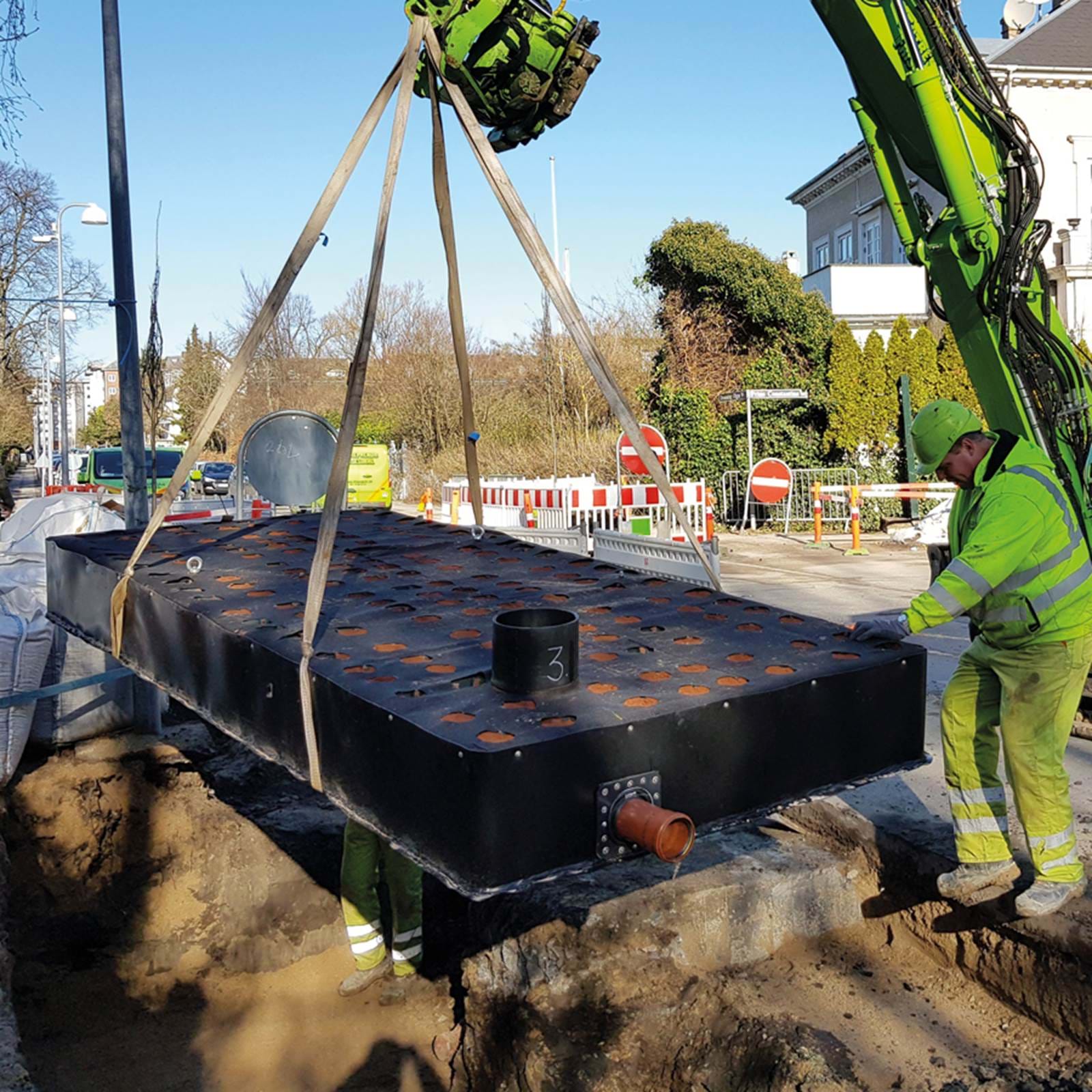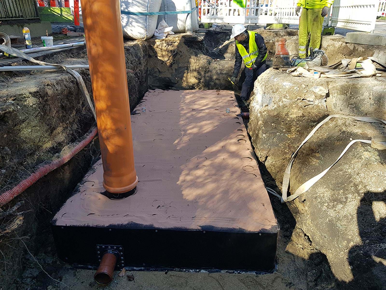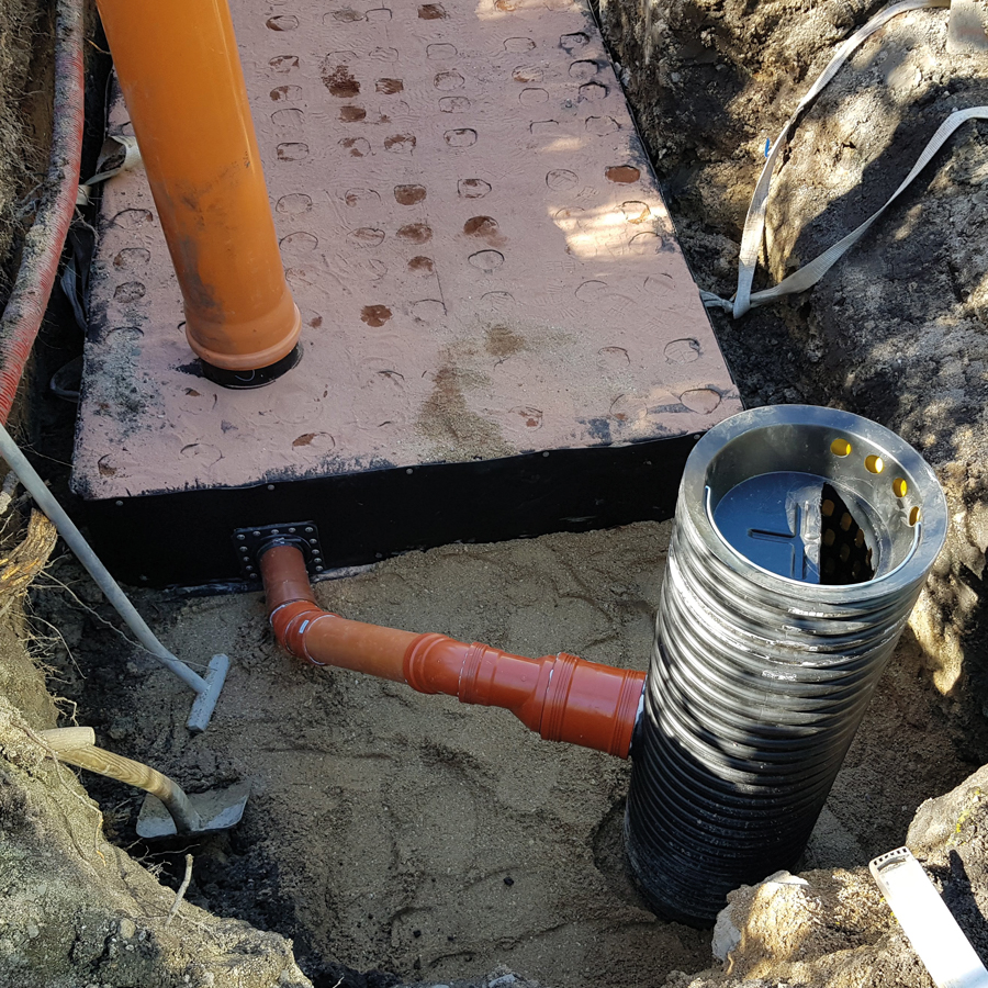 Til sidst monteres integrerede inspektionsskakte og tilslutning af ind- og udløb sker med traditionelle skydemuffer. Placering og dimensionering af ind- og udløb sker efter kundens øsnker, og kapillærmagasinet kan således designes, så det passer optimalt til forholdene installationsstedet.