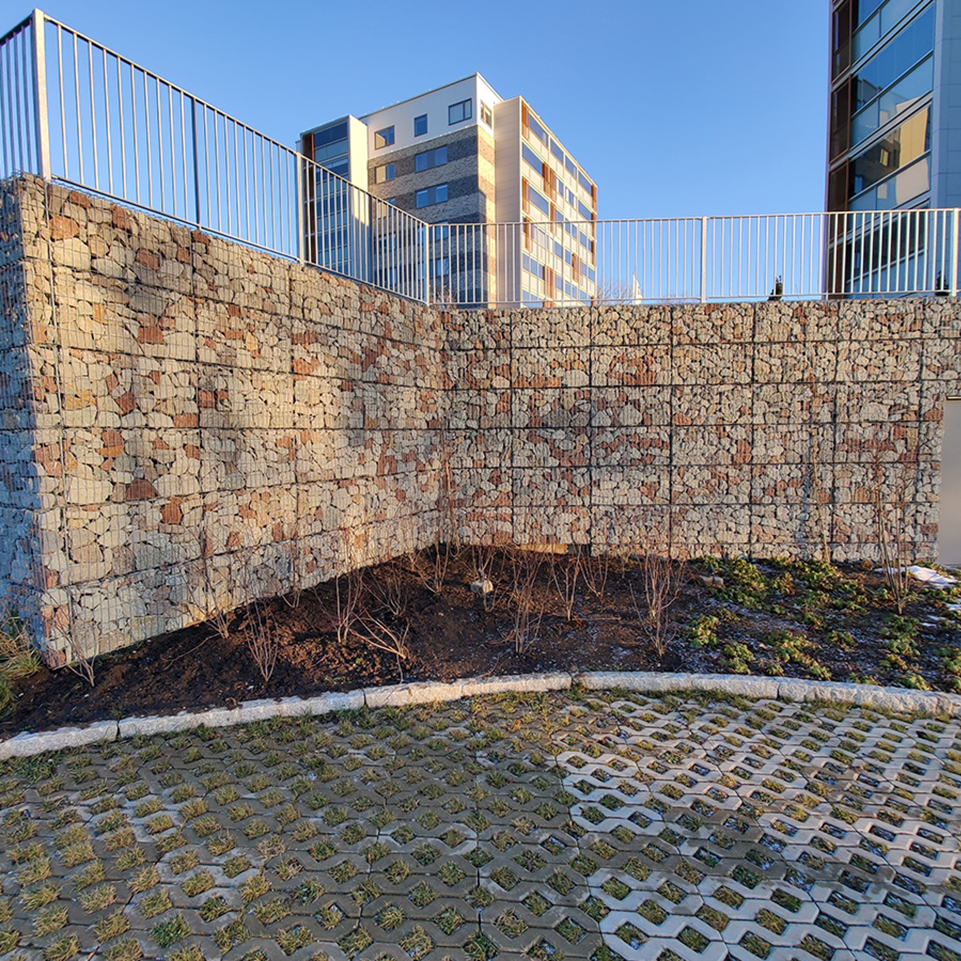 - Gabioner fästs smidigt i testat skensystem som monteras direkt på en armerad betongvägg