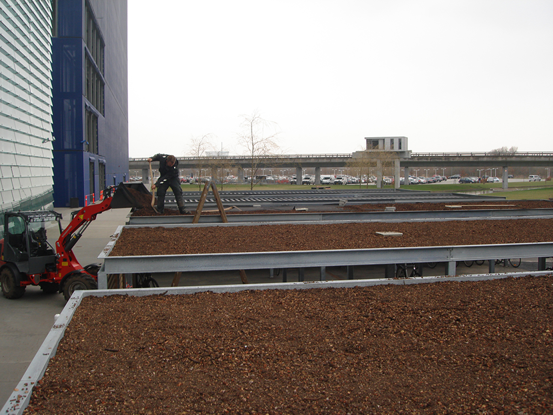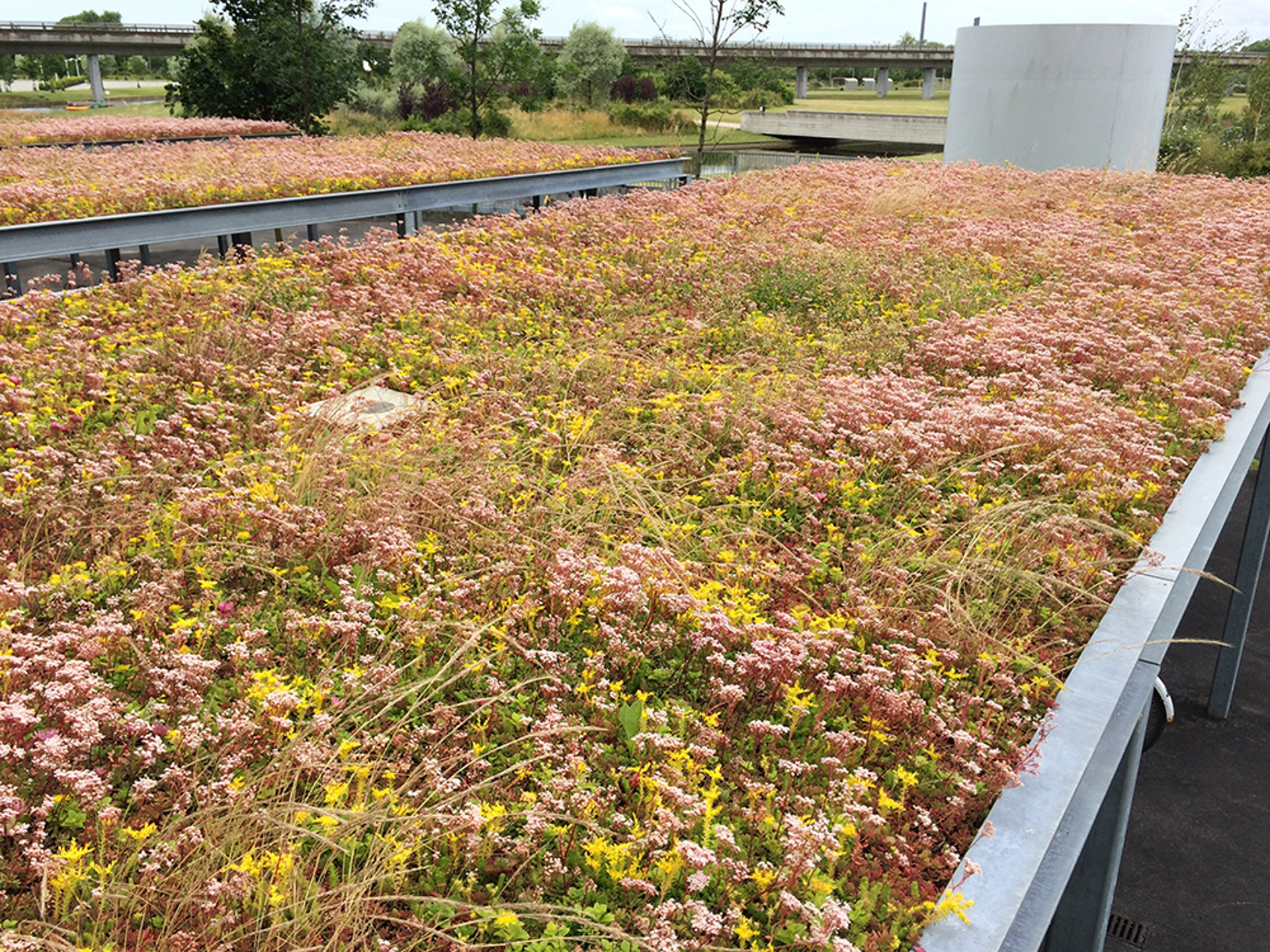 Med BGreen-it Takträdgårds-system har vi upprättat gröna takträdgårdar i marknivå. Trädgården består av gångbanor, perenner och gräs. Dessutom är det etablerat ett omfattande sedumtak. Den är anlagd med BGreen-it Sedum 100 kg sedumpluggar.