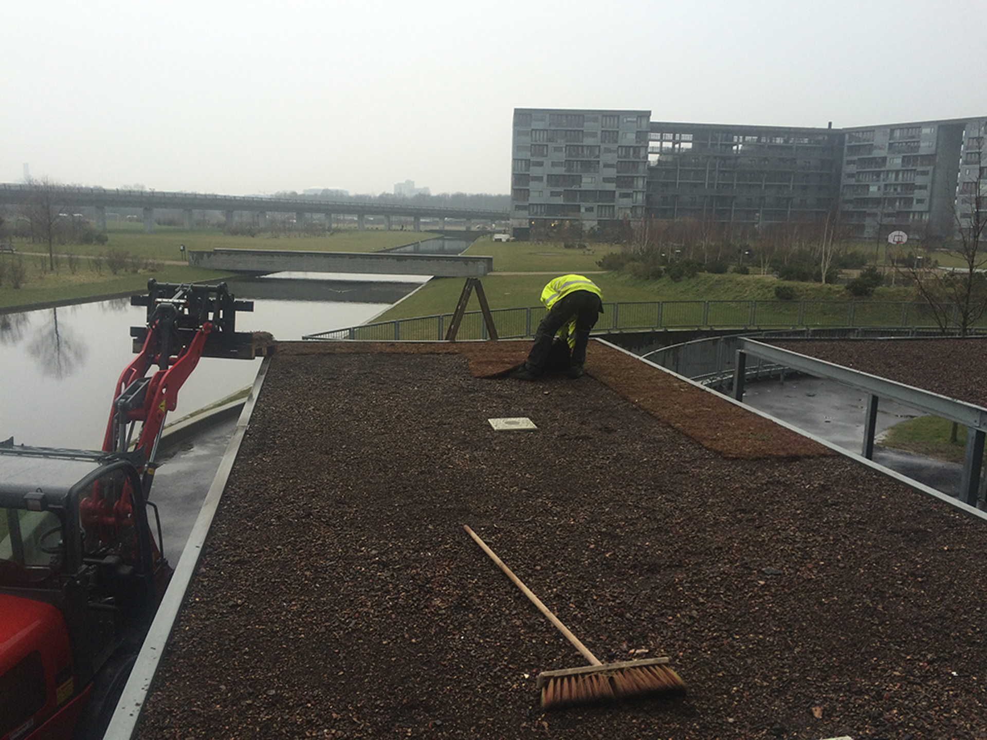 Fiberduken VLF-150 läggs ut på dräneringsplattan. Vid inspektionsboxen läggs fiberduken något upp mot sidorna för att jordsubstratet ska hållas borta från utloppet. Ovanpå fiberduken placeras jordsubstratet SEM och slutligen läggs BG Premium sedummattor eller sådd av sedumskott/sedumpluggar ut.