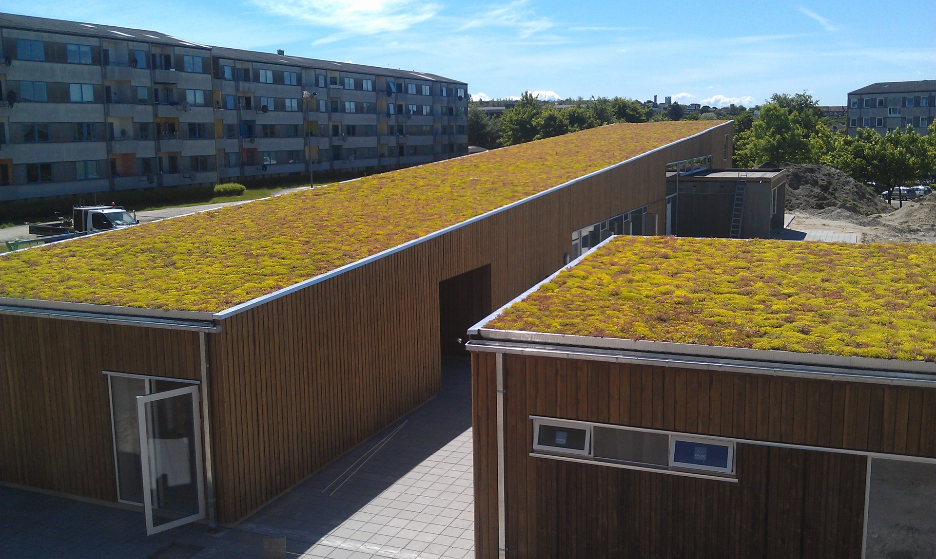 Med BGreen-it Sedum blir taket vackert integrerat i stadsmiljön. På ett nytt gemensamt hus i ett bostadsområde i Nørresundby etablerades BGreen-it Sedum gröna tak sedum 100 kg. Sedumen är en varierad mix av gräs, örter och perenner för ett mer livfullt uttryck.