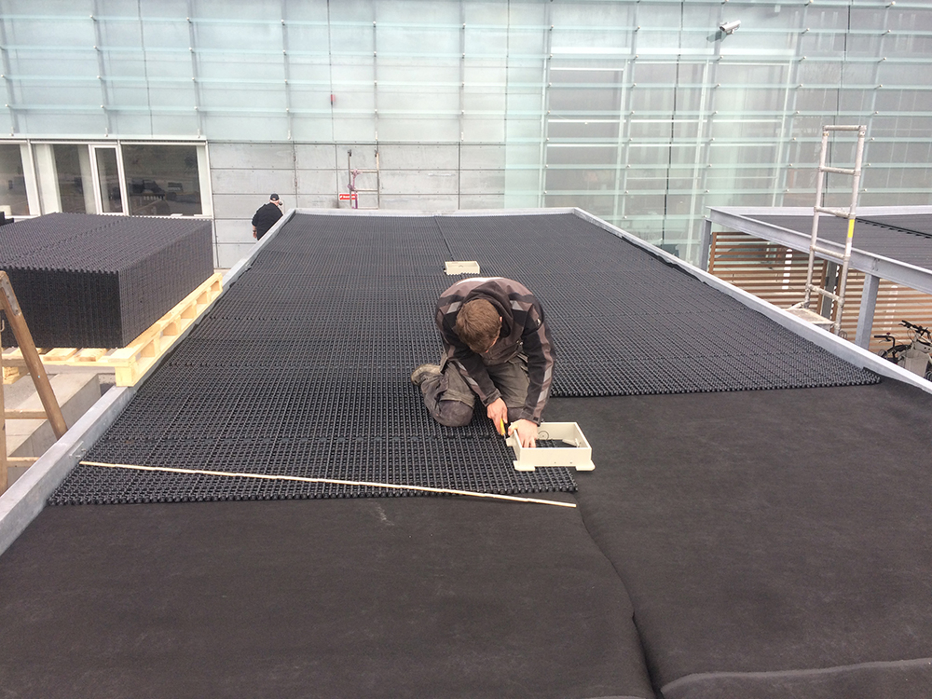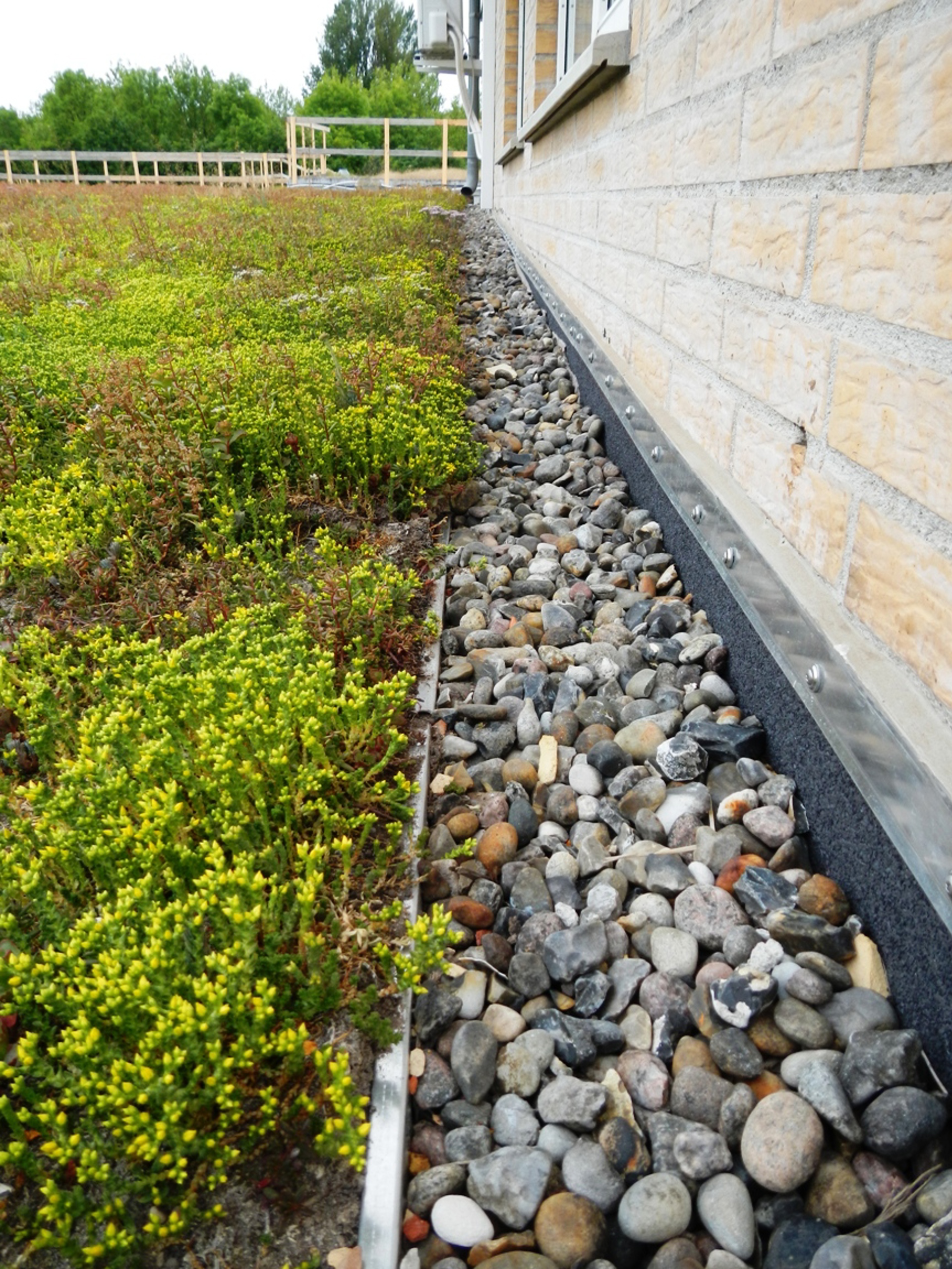 I detta projekt är de gröna taken lagda på TRP stålplåt med utlopp i mitten. Det är alltid viktigt att utloppet är görs tillgängligt för inspektion och att det är mörklagt, så att växterna inte ska växa in i utloppet och täppa igen det. Därför är ett traditionellt bladfång omgivet av sten inte en lösning att föredra. Här har man i stället valt en inspektionsbox, vilken ger god dränering och möjliggör inspektion av utloppet. På TRP-plåten rullas en VLU-300 vattenhållande skyddsduk ut. Ovanpå denna läggs DiaDrain 25H dräneringsplattor. Över utloppet görs ett hål i dräneringsplattan ner till inspektionsboxen KSE-06.